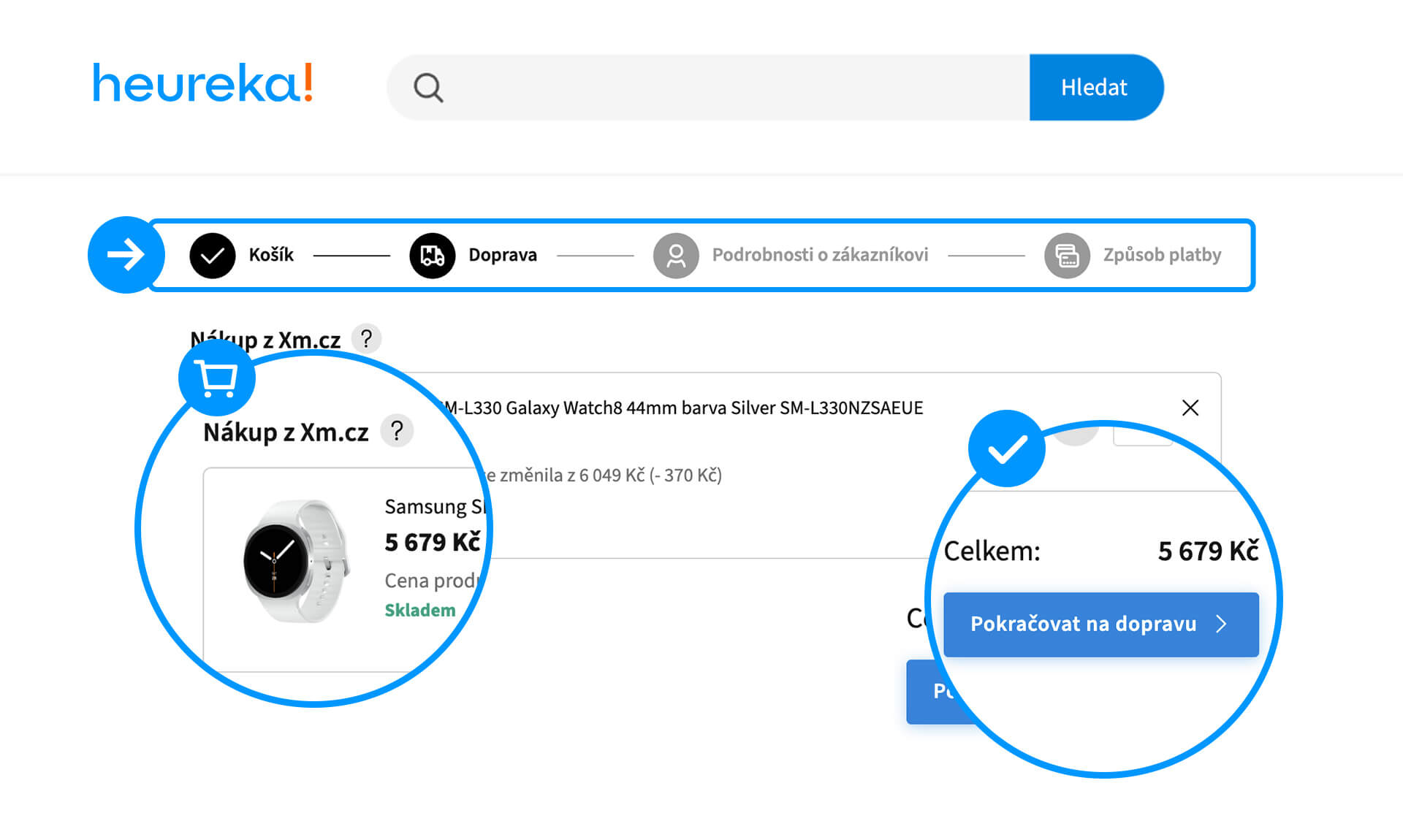 | V horní části stránky najdete pořadí kroků, které vedou k dokončení objednávky. Nyní jste v prvním kroku. |